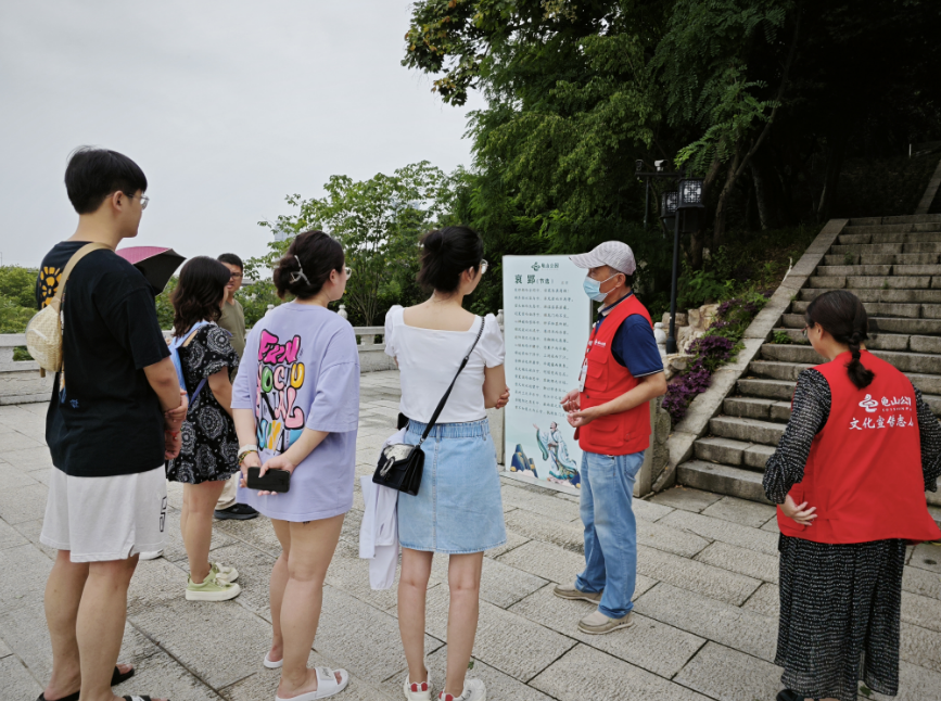 龟山文化宣传志愿者团队成立于2023年6月18日,目前团队成员11人,端午节是他们的讲解首秀。今后每逢节假日,志愿者们便会身着红马甲,在屈原望郢台、蝴蝶泉为游客讲述龟山上的历史文化故事。今年73岁的王新,目前是这支队伍的队长。他表示,龟山有47处文化景点,但少为人知,一定要通过志愿服务,将龟山历史文化故事讲好。