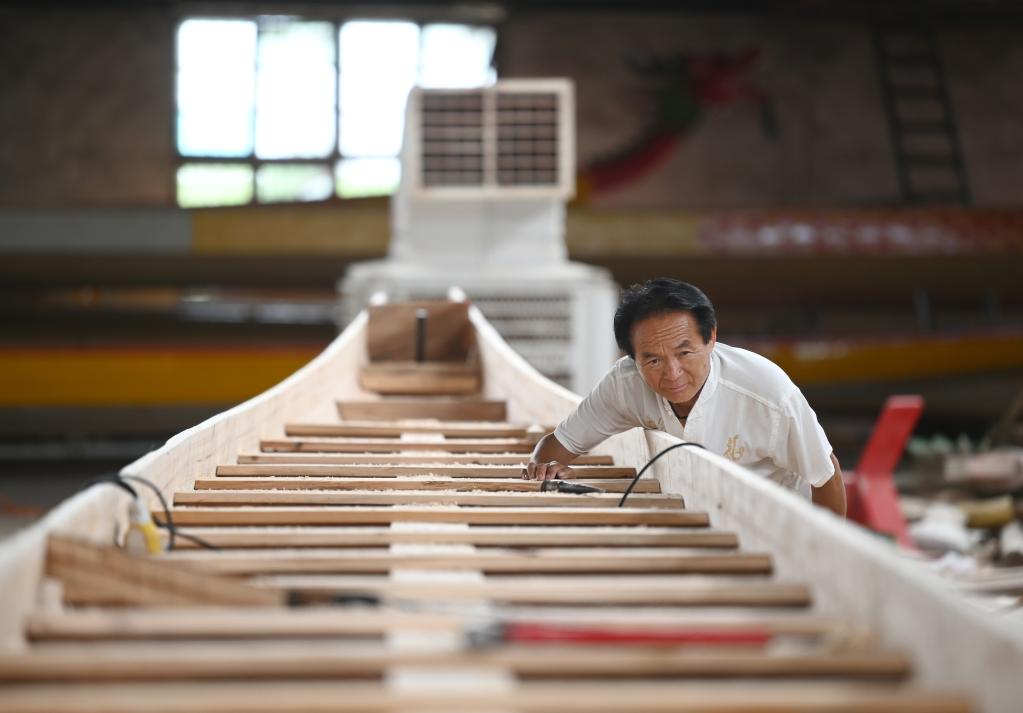 资料图:许桂生正在检查龙舟的船舷。新华社记者李尕摄
