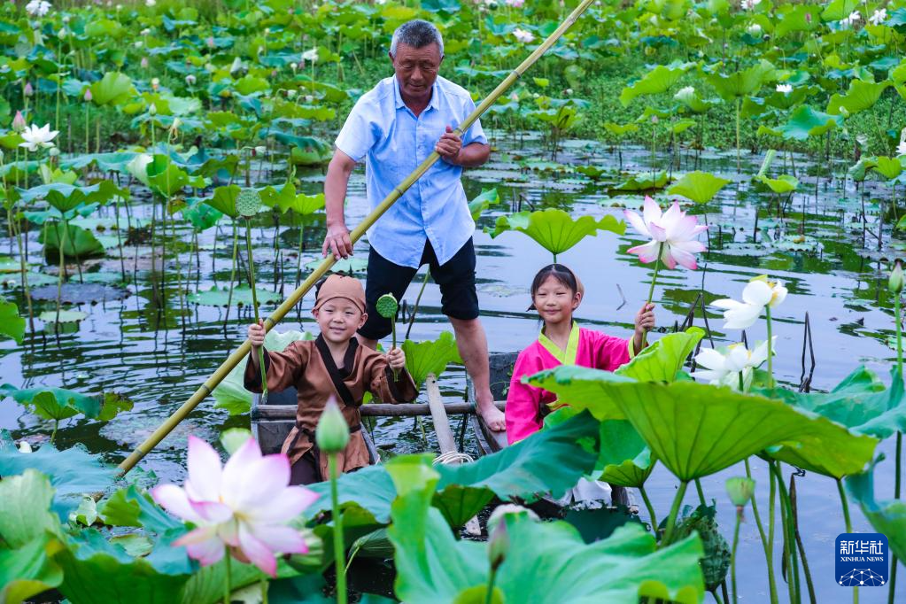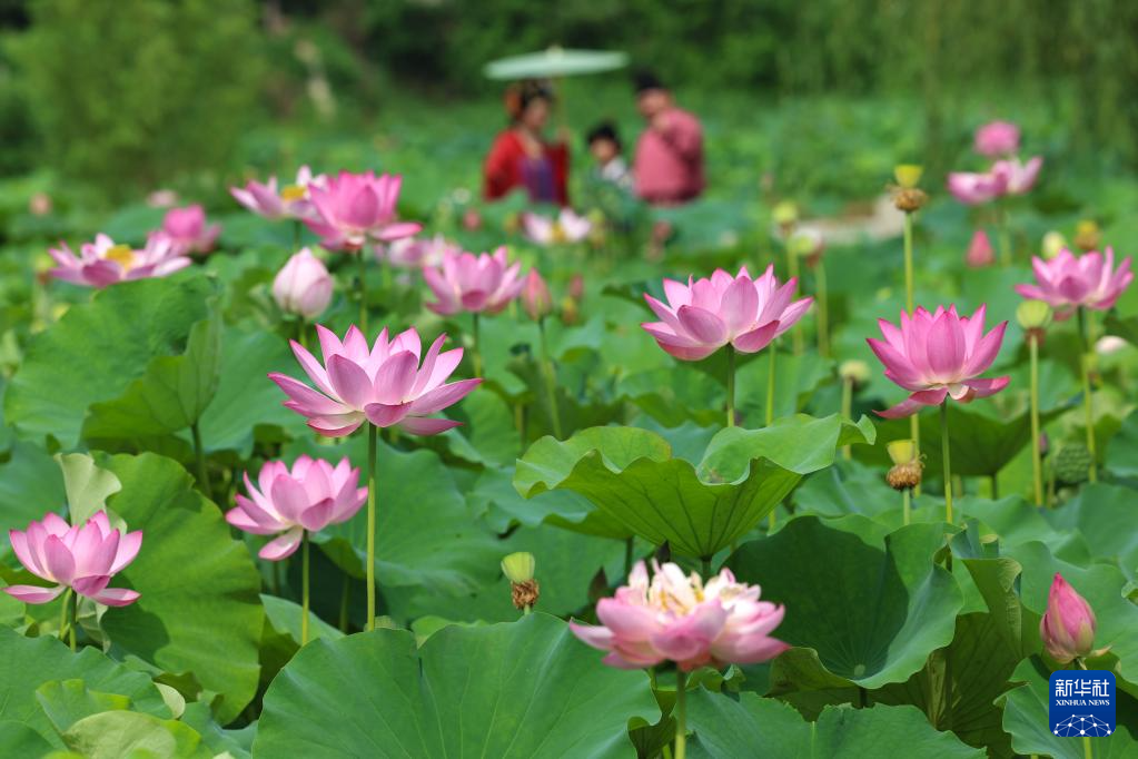 7月1日,游人在湖北省襄阳市襄城区尹集乡姚庵村荷塘赏荷游玩。新华社发(杨东摄)