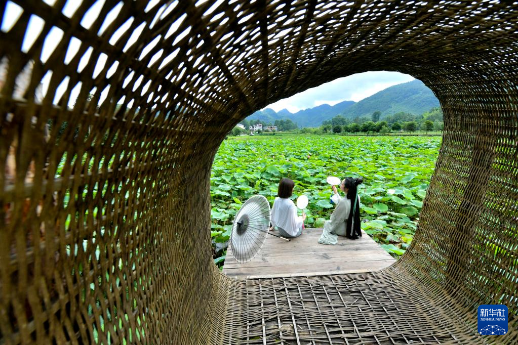 7月2日,游客在湖北省宣恩县高罗镇麻阳寨村的农家休闲山庄赏荷游玩。新华社发(宋文摄)