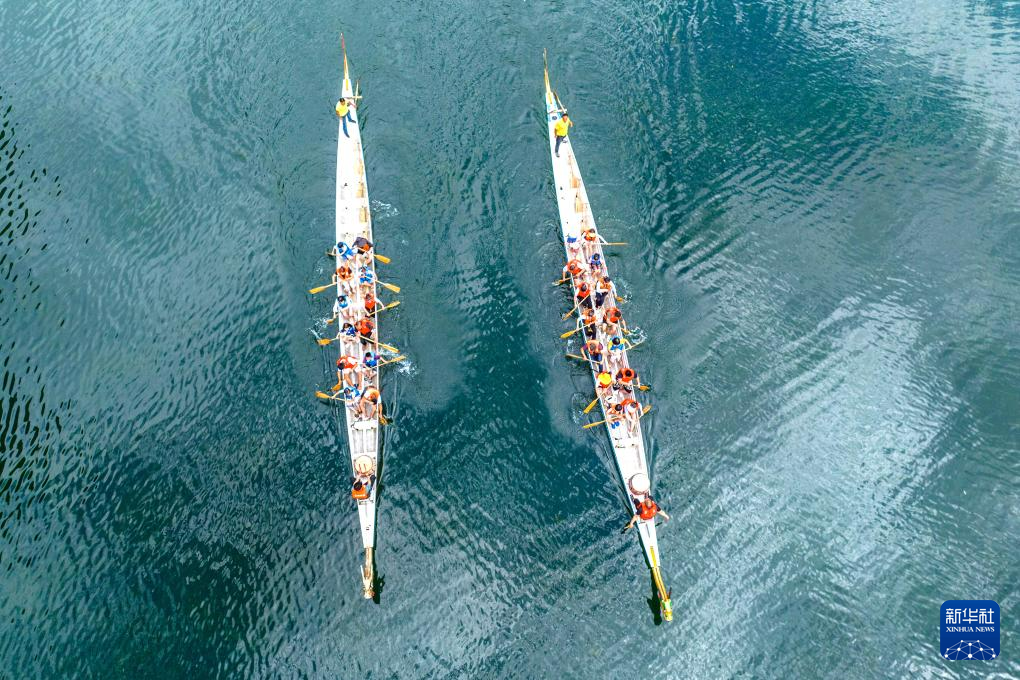 7月21日,游客在湖北省宜昌市秭归县三峡竹海生态景区体验划龙舟(无人机照片)。