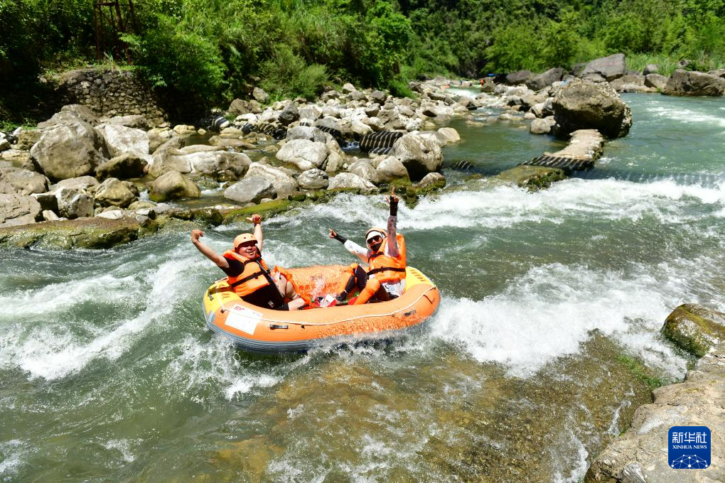 7月22日,游客在贵州省黔东南苗族侗族自治州施秉县杉木河景区漂流、戏水。