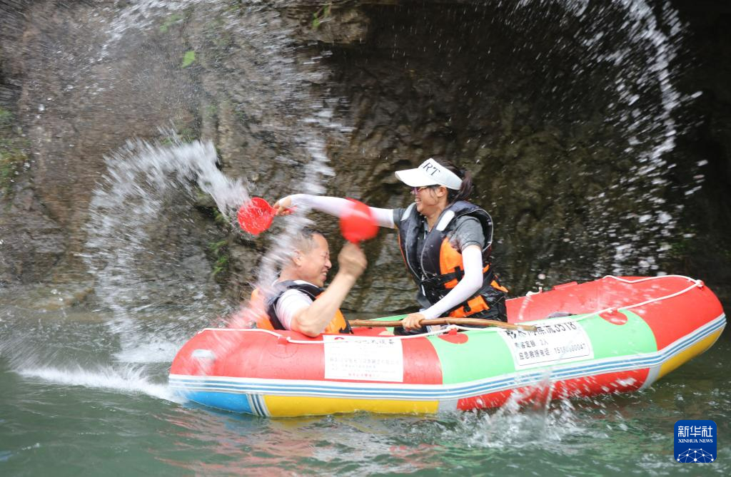 7月22日,游客在湖北省宜昌市秭归县九畹溪漂流景区体验峡谷漂流。
