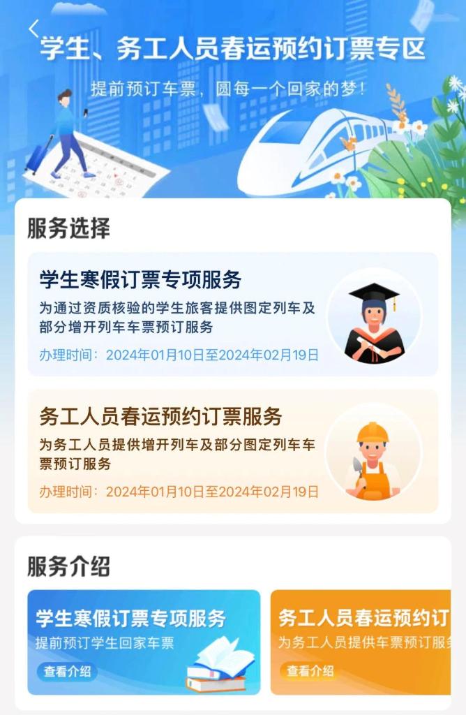 自1月10日零时起,铁路12306手机客户端推出春运期间学生、务工人员专区预约购票功能。