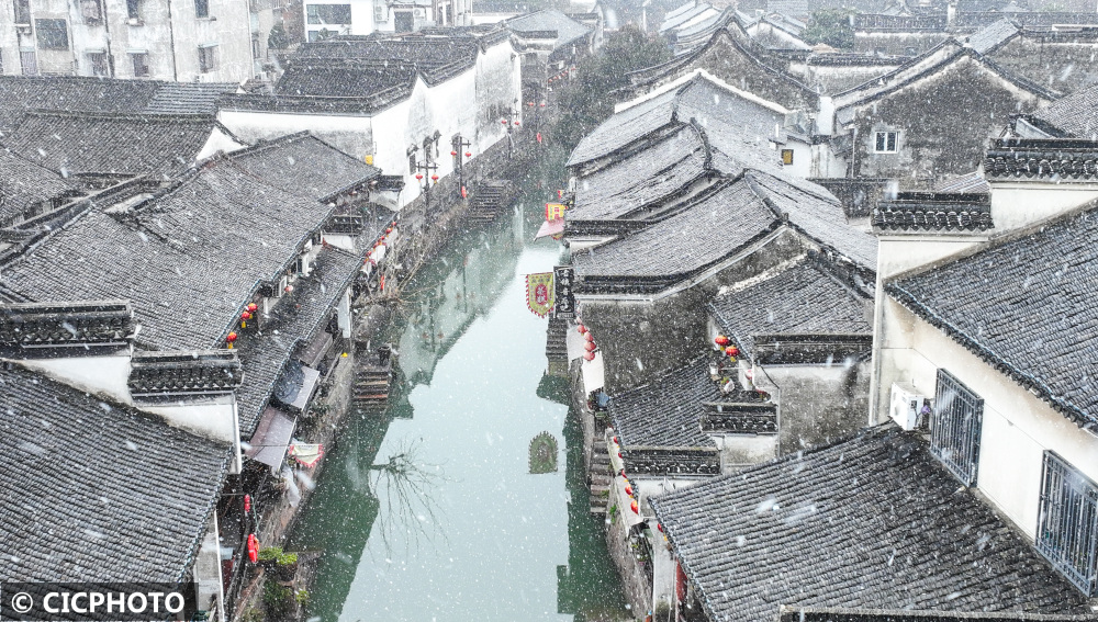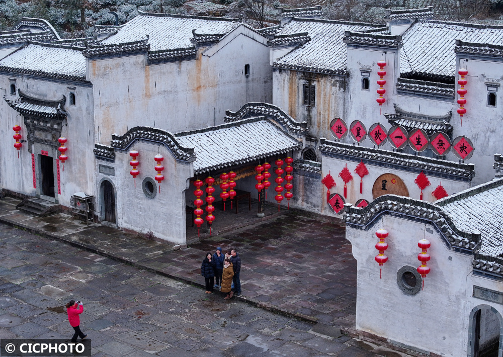 ↑2024年1月22日,游人在安徽省黄山市徽州区呈坎村赏雪拍照。(无人机照片)CICPHOTO/施亚磊 摄