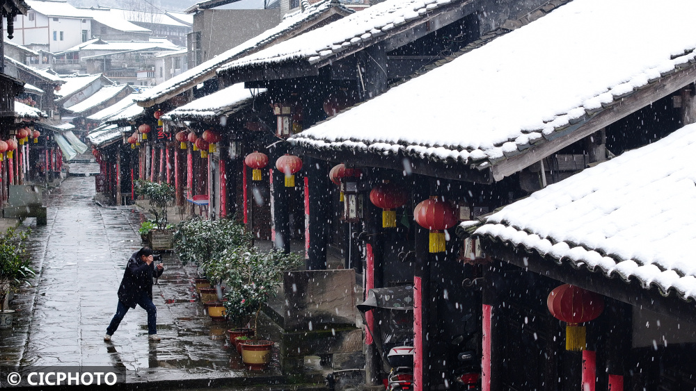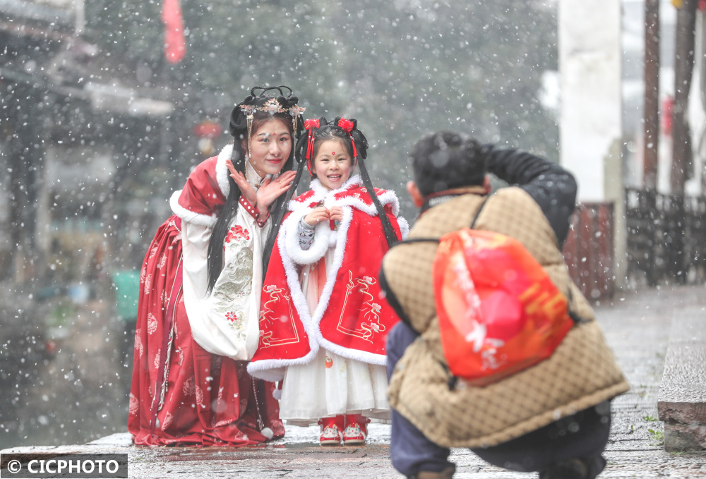 ↑2024年2月6日,游人在浙江省湖州市德清县新市古镇赏雪拍照。CICPHOTO/王树成 摄