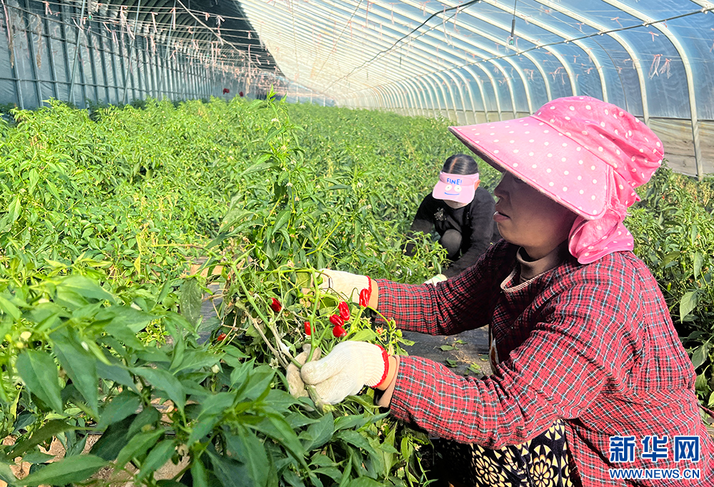 春节期间,湖北郧西县香口乡农场工作人员在采摘辣椒。新华网发 孟莹摄