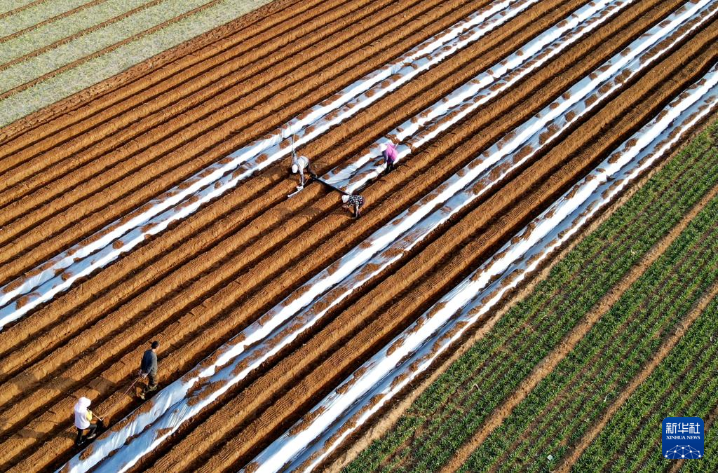 3月2日,在山东省临沂市平邑县地方镇,农民在田间为种植的土豆覆盖地膜(无人机照片)。