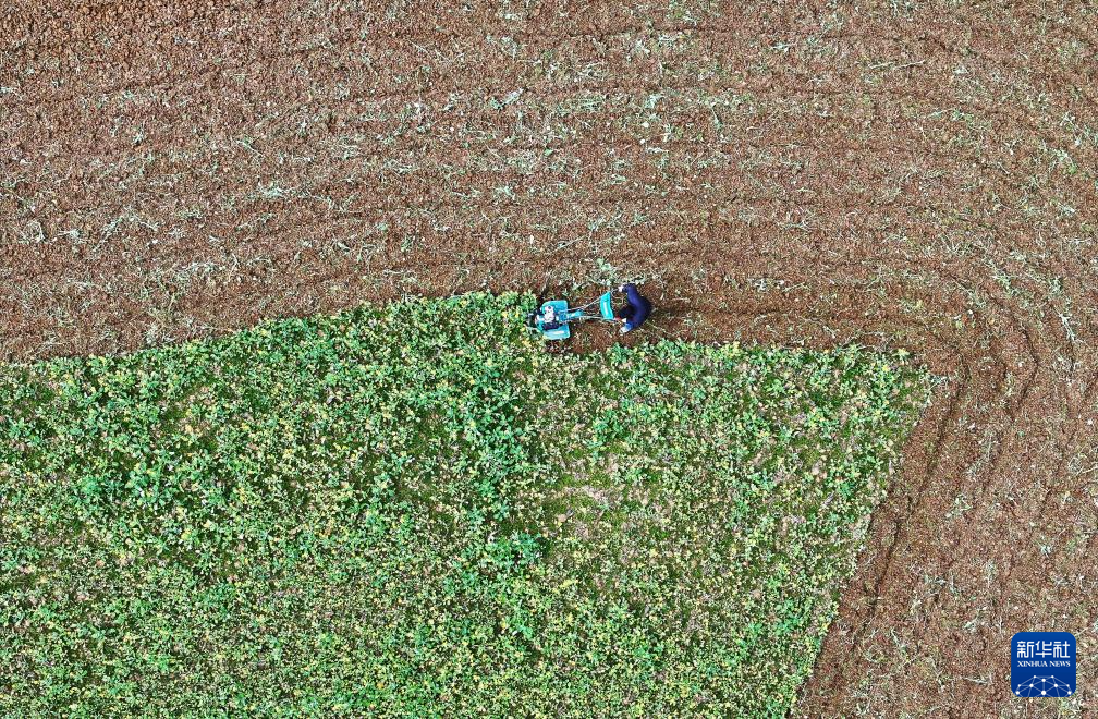 3月2日,贵州省福泉市陆坪镇罗坳村村民驾驶农机翻整田地,为播种做准备(无人机照片)。