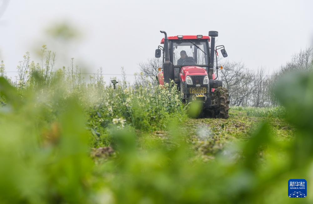 3月1日,在湖南省永州市道县清塘镇楼田村,农民在驾驶机械翻耕农田。