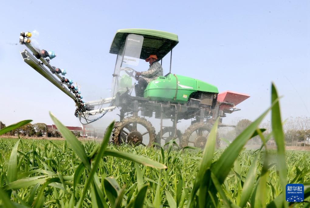 3月2日,在浙江省德清县禹越镇天皇殿村,农机手驾驶自走式喷雾机进行小麦病虫害防治作业。
