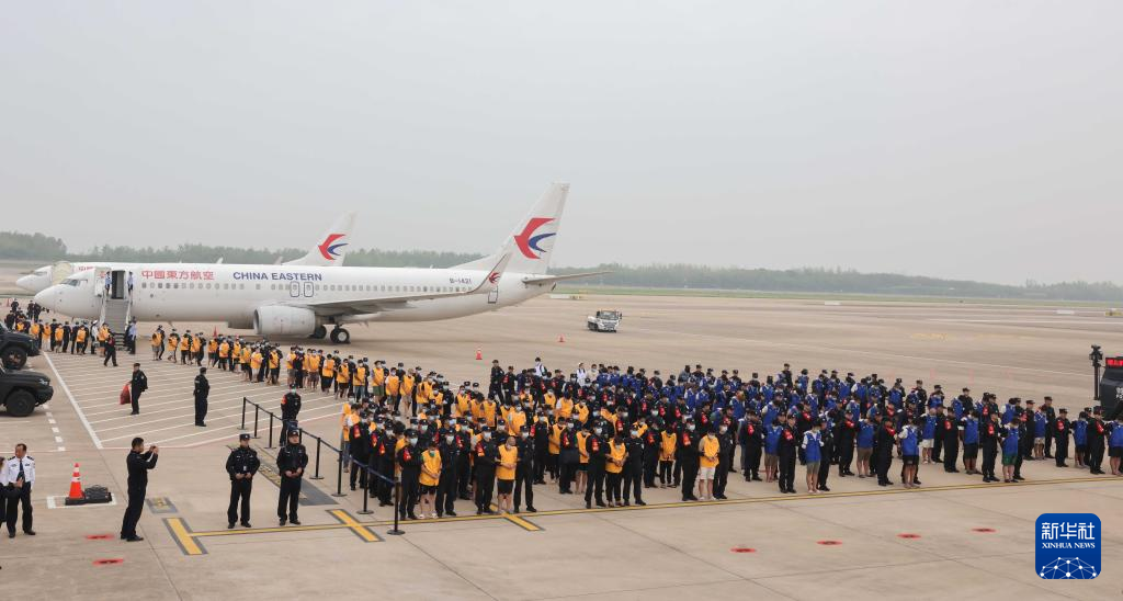 4月13日,中国籍涉赌诈违法犯罪嫌疑人被我公安机关押解上回国包机。新华社记者 殷刚 摄