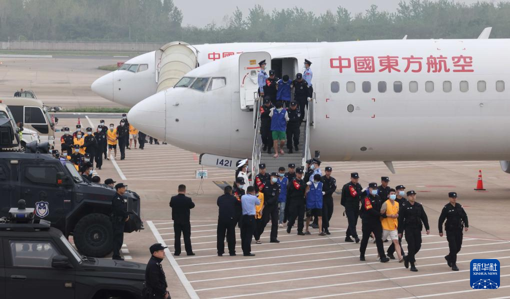 4月13日,在湖北武汉天河国际机场,中国籍涉赌诈违法犯罪嫌疑人被我公安机关押解回国。新华社记者 殷刚 摄