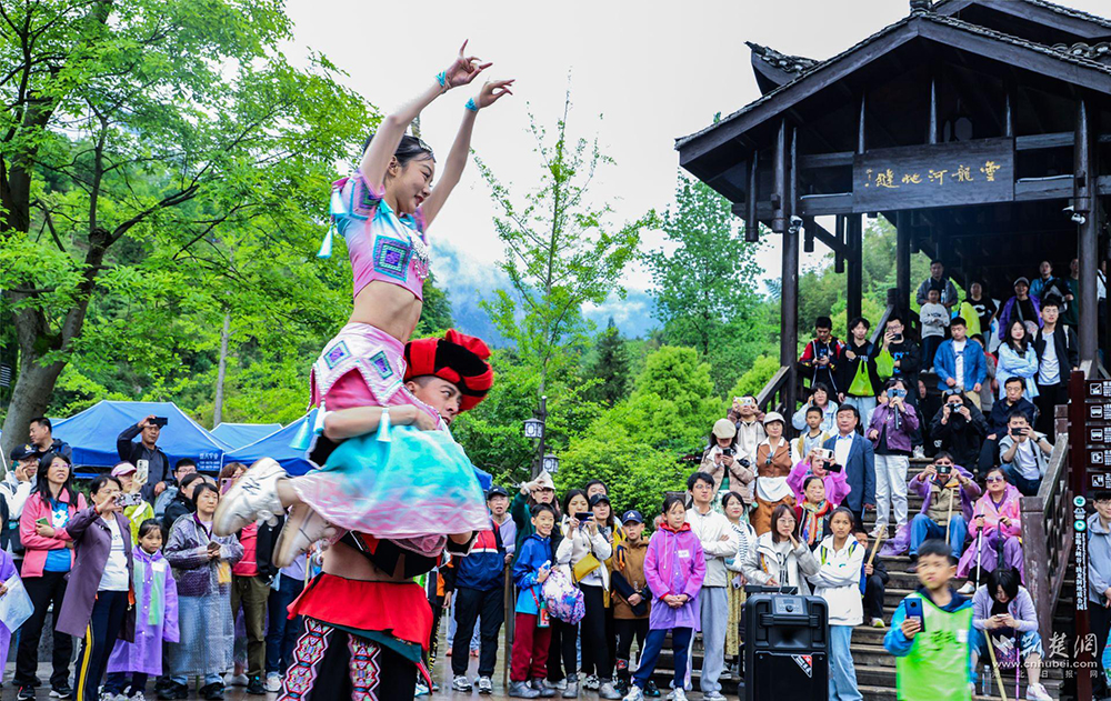 为了积极应对游客高峰和天气影响,景区在沿途设置古筝与茶艺表演,游客拍照打卡,品茶听琴,感受传统文化的魅力。在游客中心广场和游客休息广场,游客还可观赏土家迎客礼、民俗快闪表演,缓解旅途疲劳,增添出游乐趣。