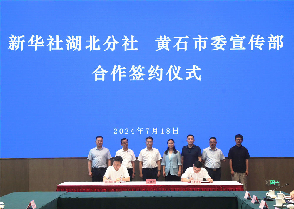 新华社客户端武汉7月18日电 黄石市委宣传部与新华社湖北分社18日在黄石举行合作签约仪式。黄石市委常委、市委宣传部部长王玲和新华社湖北分社社长、分党组书记惠小勇见证签约仪式,新华社新闻信息中心湖北中心主任詹国强和黄石市委宣传部副部长丁元拾代表双方签署协议。