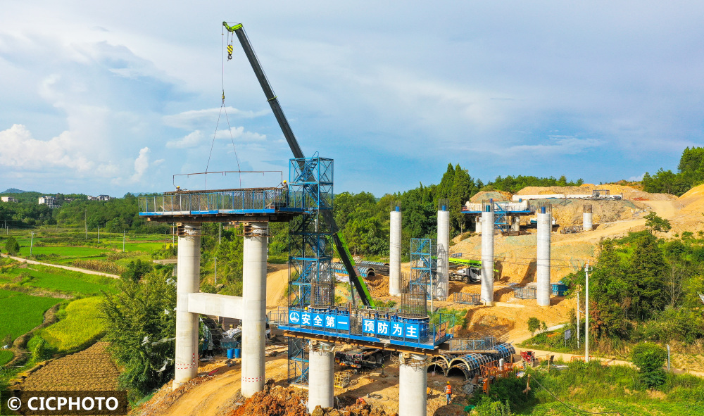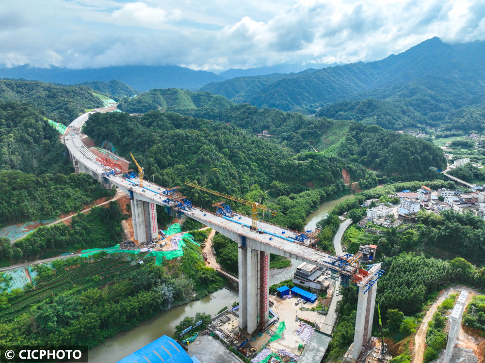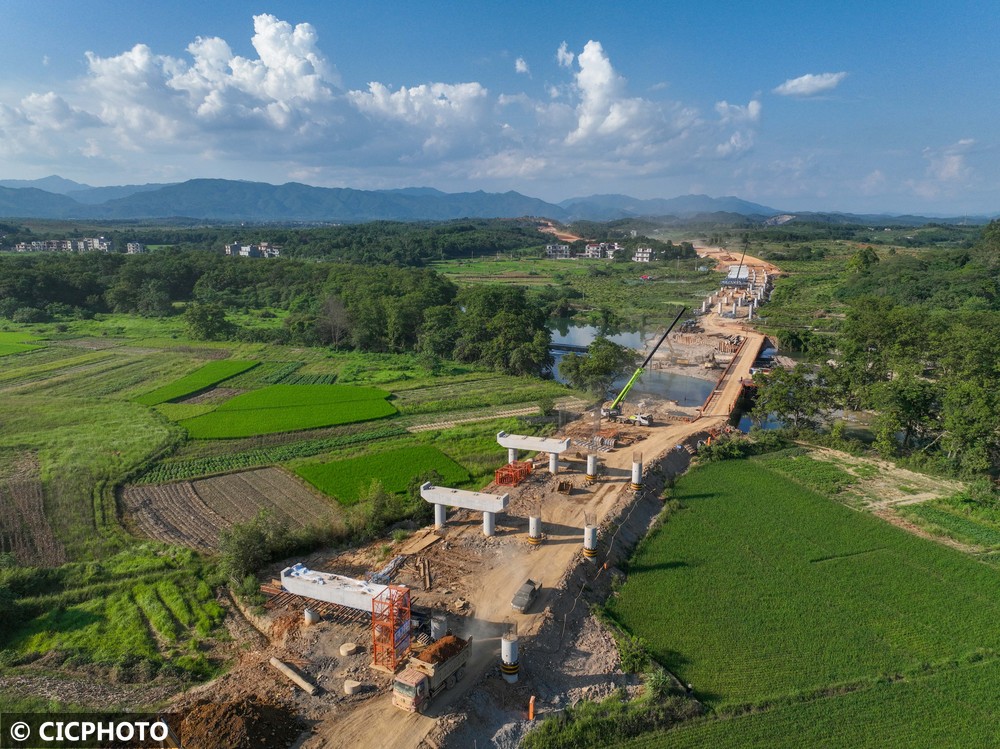 ↑2024年8月6日在湖南省永州市新田县大坪塘镇拍摄的桂新高速下圩大桥施工现场。(无人机照片)CICPHOTO/刘贵雄 摄