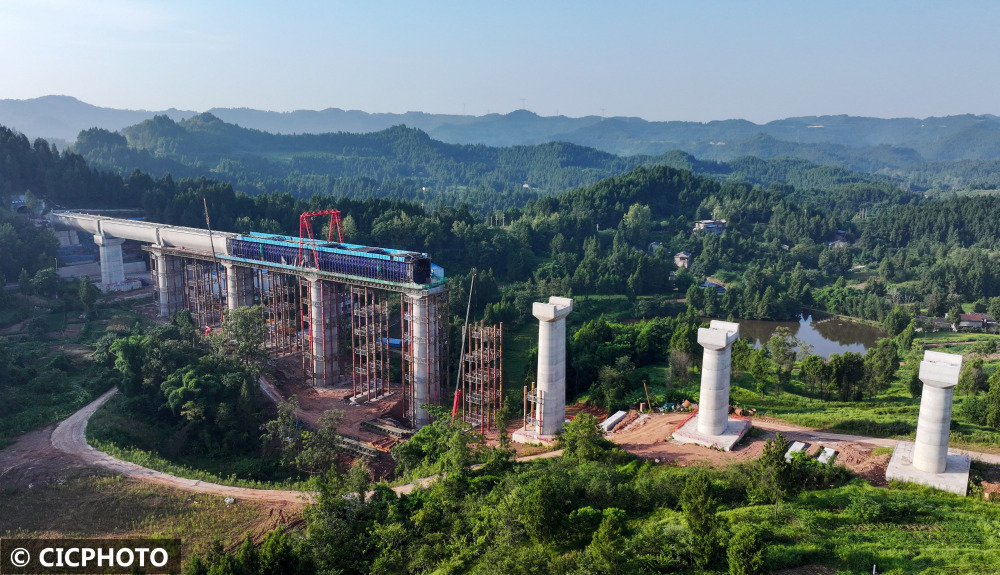 ↑2024年8月14日在四川省南充市蓬安县拍摄的亭子口灌区一期工程金甲坪渡槽施工现场。(无人机照片)CICPHOTO/刘永红 摄
