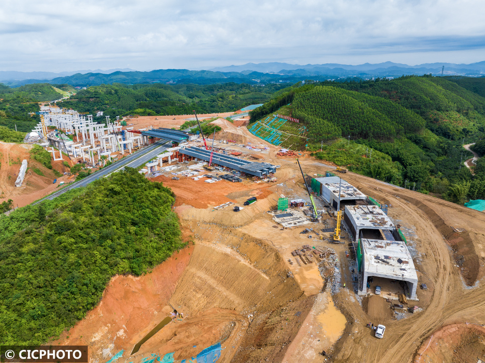 ↑2024年8月13日在广东省信宜市拍摄的阳信高速水口南枢纽施工现场。(无人机照片)CICPHOTO/何华文 摄