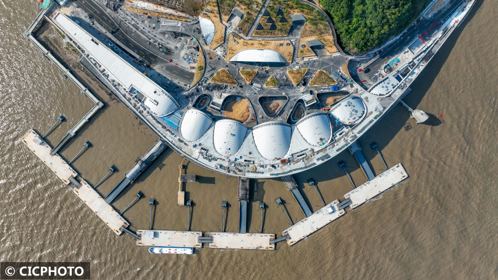 ↑2024年8月11日在浙江省舟山市普陀区拍摄的东港(半升洞)客运站场及城市广场施工现场。(无人机照片)CICPHOTO/邹训永 摄