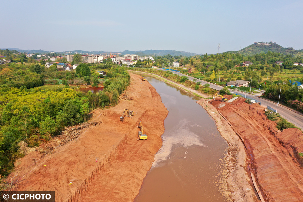 ↑2024年8月30日在四川省广安市广安区拍摄的西溪河浓溪镇新民段防洪治理工程现场。(无人机照片)CICPHOTO/廖小兵 摄