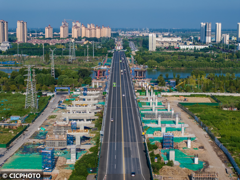 ↑2024年8月31日在江苏省宿迁市拍摄的宿迁大道快速化改造工程一处施工现场。(无人机照片)CICPHOTO/纪星名 摄