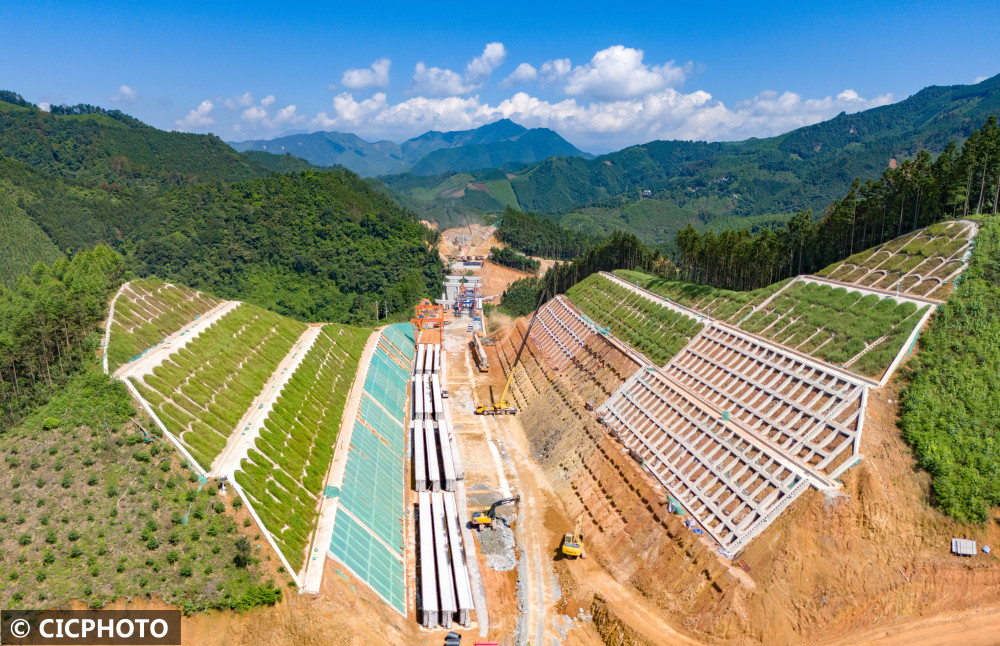 ↑2024年8月4日在广西贺州市八步区拍摄的连贺高速公路一处施工现场。(无人机照片)CICPHOTO/黎豪图 摄 编辑:马兰