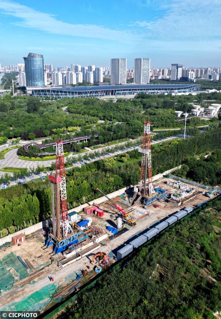↑2024年9月3日在山东省东营市东营区滨河北路拍摄的中深层地热能替代燃煤供暖项目施工现场。(无人机照片)CICPHOTO/刘智峰 摄