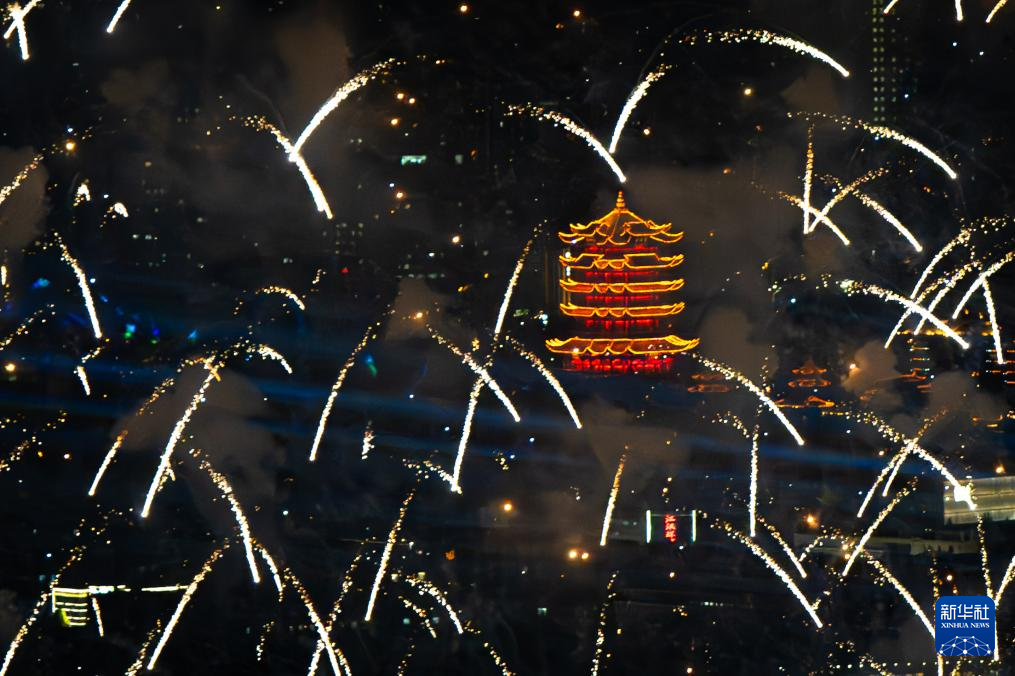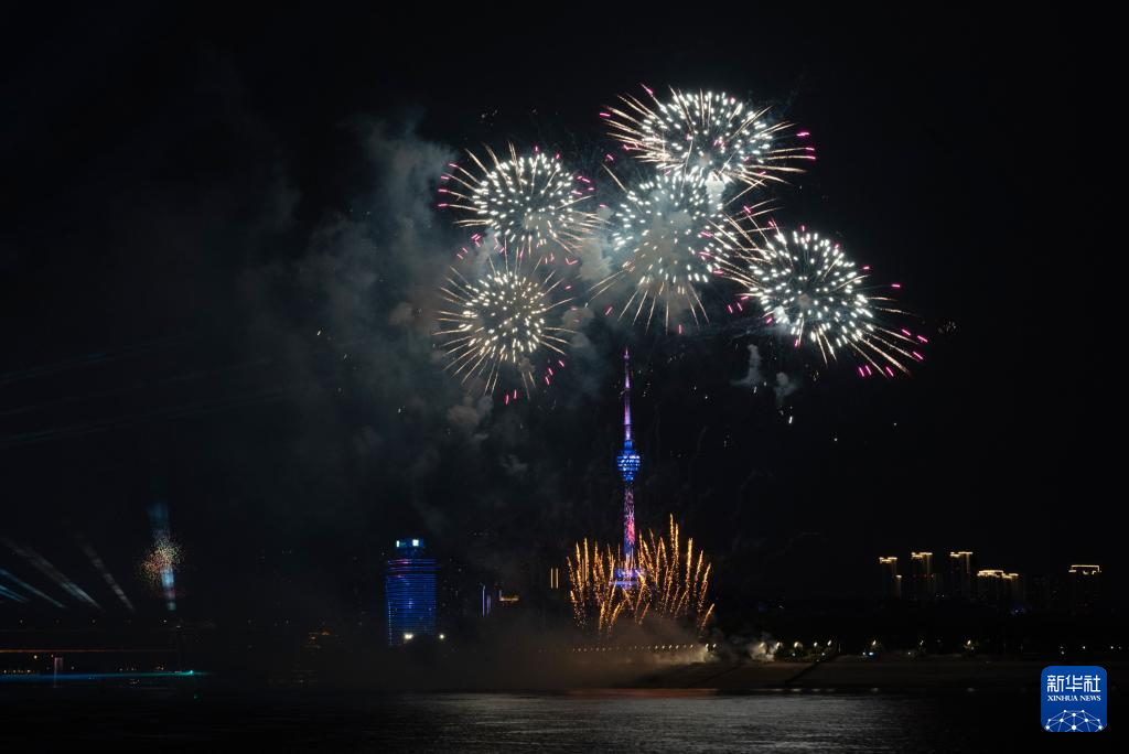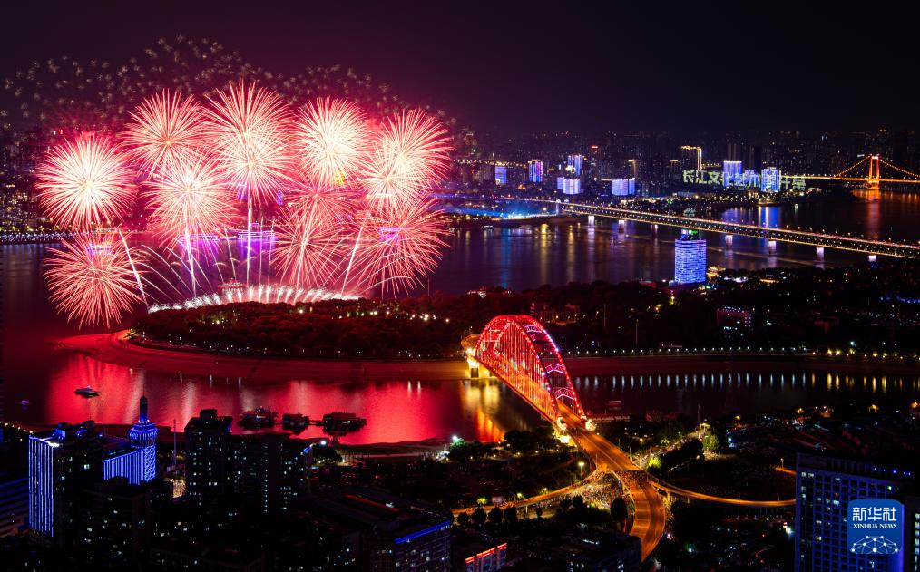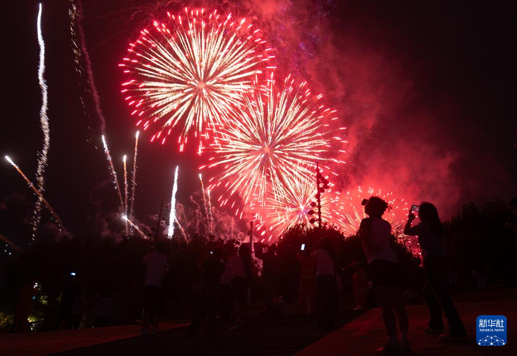 9月14日,在湖北省武汉市南岸嘴江滩公园,市民在观赏烟花。