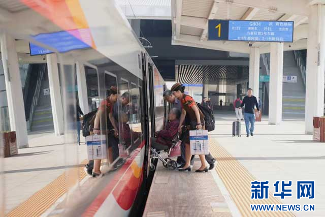 图为襄阳客运段列车长主动帮扶重点旅客乘车。新华网发 李强 摄