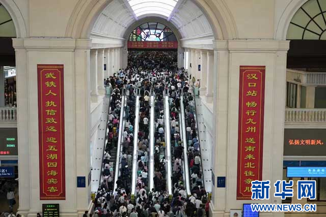 10月1日,国庆假期首日,中国铁路武汉局集团有限公司迎来客流出行最高峰,管内128个客运站共发送旅客112.1万人次,同比增长6.5%,接近日常的3倍,其中武汉、汉口、武昌三大站发送旅客近50万人次。