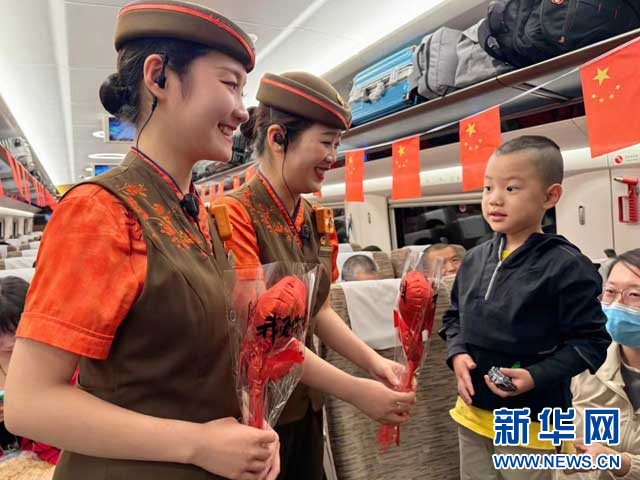 图为武汉客运段G3453次乘务人员为旅客发放小红旗庆祝国庆节。新华网发 李宜蓉 摄