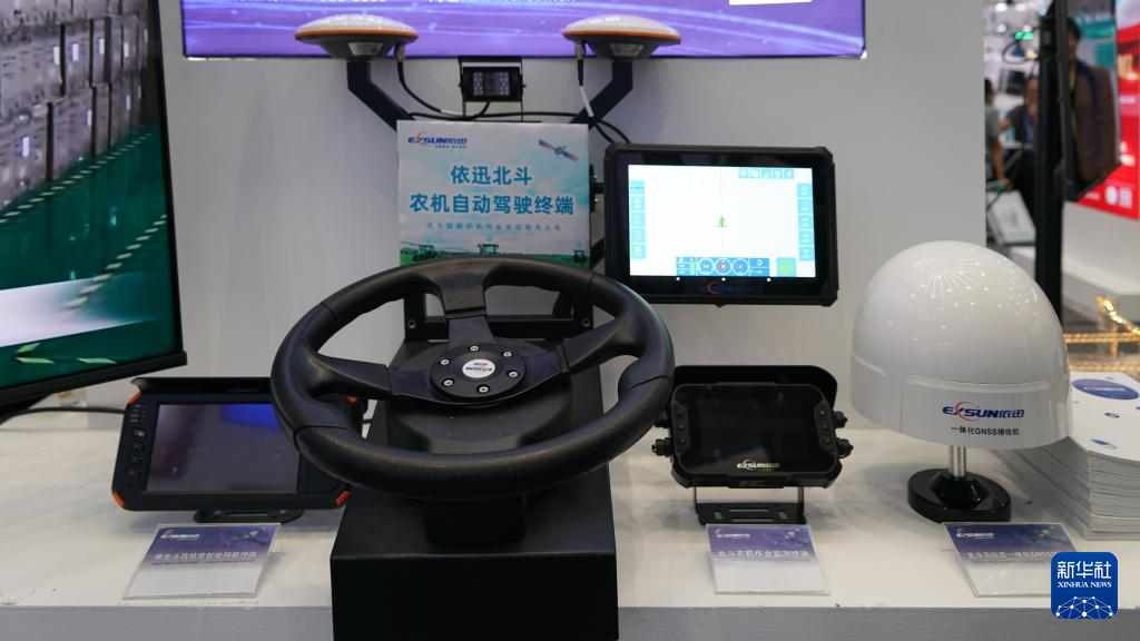 在湖北省粮机展区,一台北斗农机自动驾驶终端的方向盘正自动校准方向,旁边的监测屏幕上模拟着农机运行轨迹,吸引了不少参观者驻足。