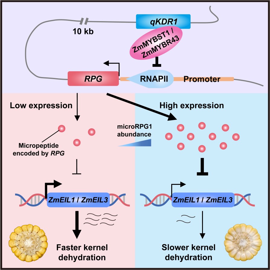 研究团队围绕这个产业关键问题持续攻关,鉴定到一个影响玉米籽粒脱水的小肽microRPG1,是玉米及其近缘种中特有的一种含31个氨基酸的新型小肽,由非编码序列从头起源,通过精确调节乙烯信号通路关键基因的表达来控制籽粒脱水。多年多点的试验表明,敲除microRPG1可使收获时的玉米籽粒含水量下降2%至17%,平均下降7%,同时其他农艺和产量性状没有明显的变化。研究团队分析了数百份具有代表性的玉米种质材料,发现几乎所有的材料都存在RPG基因,这意味着操纵RPG基因来改变籽粒脱水速率培育宜机收的品种具有巨大的应用潜力。