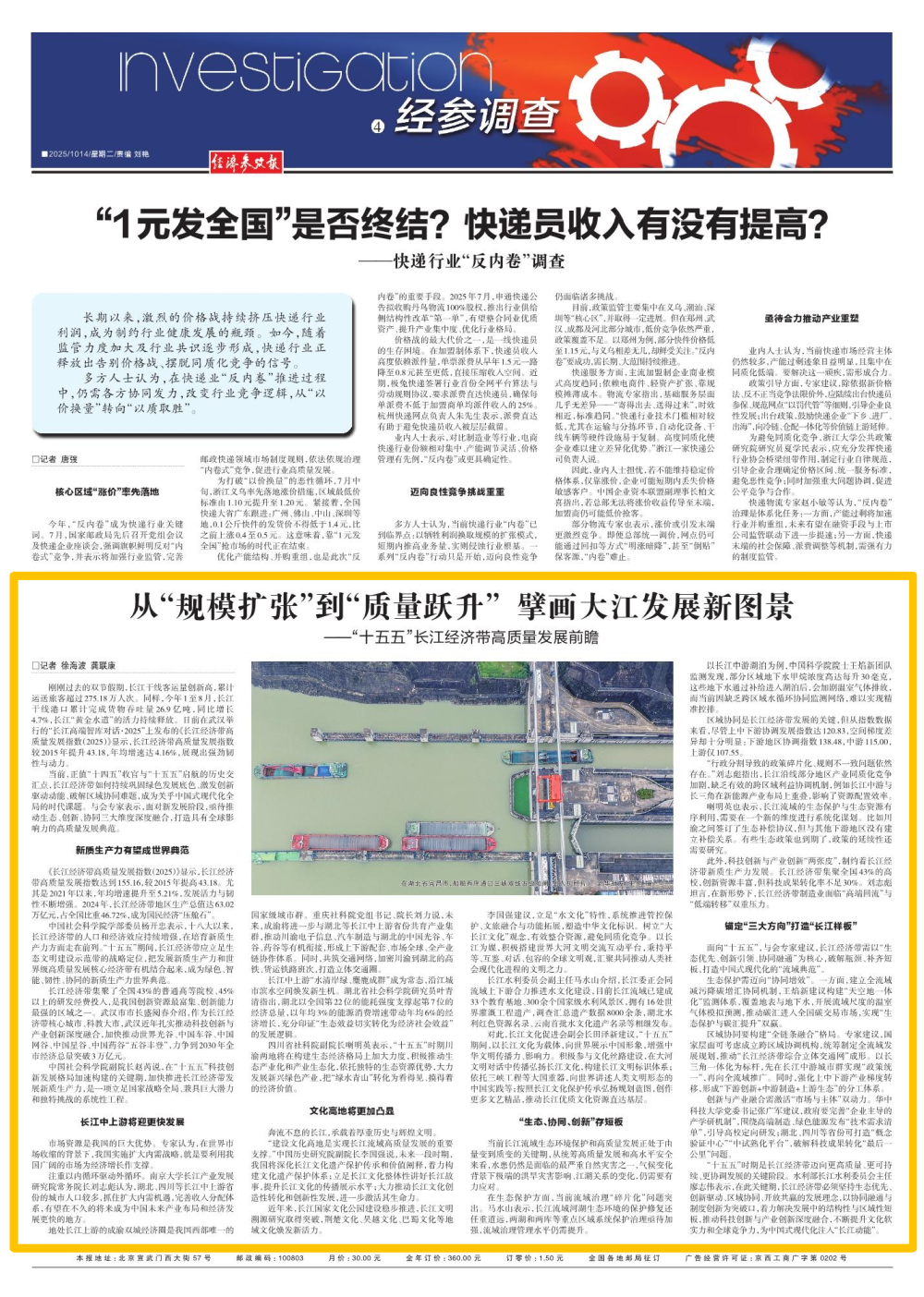 面向“十五五”,与会专家建议,长江经济带需以“生态优先、创新引领、协同融通”为核心,破解瓶颈、补齐短板,打造中国式现代化的“流域典范”。