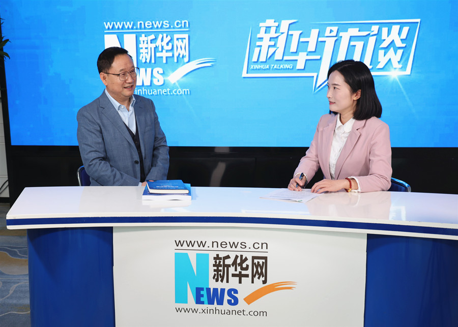 图为湖北工业大学党委书记彭育园做客新华访谈。新华网 连迅 摄