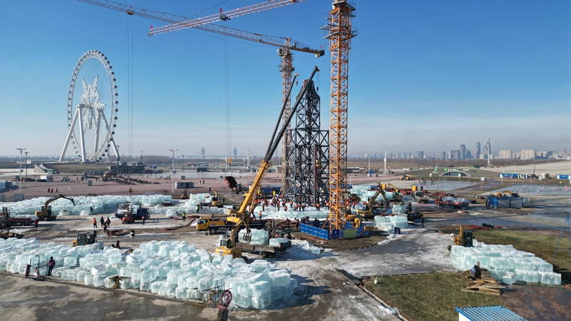 2025年11月25日在黑龙江哈尔滨拍摄的第二十七届哈尔滨冰雪大世界冰建工程施工现场(无人机照片)。11月25日,随着20万立方米存冰陆续运抵园区,第二十七届哈尔滨冰雪大世界冰建工程正式启动。本届园区面积扩大至120万平方米,成为历史上规模最大的一届。新华社发 (刘洋 摄)