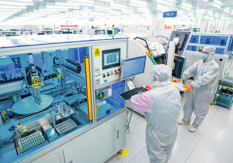 在位于武汉中国光谷的光电器件研发制造商——武汉光迅科技股份有限公司生产车间内,工作人员在光模块生产线作业(2024年2月5日摄)肖艺九摄/本刊