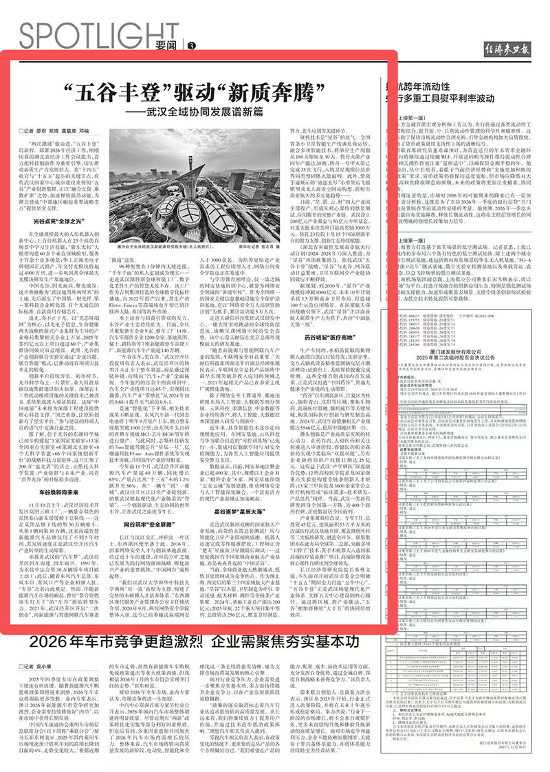 “两江潮涌”催奋进,“五谷丰登”启新程。部署2026年经济工作,刚刚闭幕的湖北省经济工作会议提出,着力把科技创新作为重要引擎,切实推动新质生产力发展壮大。在“十四五”收官与“十五五”起步的关键节点,肩负武汉国家中心城市建设重任的“五谷”产业创新集群,正以“融合互促、乘数扩张”之势,加速释放强劲动能,为湖北建成“中部地区崛起重要战略支点”提供坚实支撑。