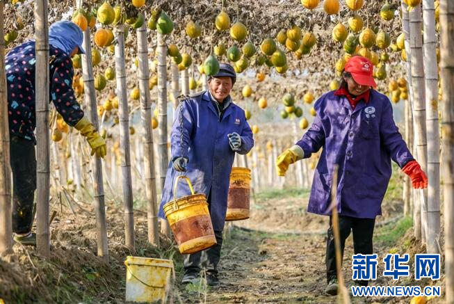 近日,湖北省荆门市东宝区仙居乡珍珠村的60余亩瓜蒌种植基地里,一派繁忙的丰收景象。藤架之上,金灿灿的瓜蒌果实累累,犹如一串串“金元宝”。架下,村民们麻利地进行采摘、装运,脸上洋溢着喜悦的笑容。这种兼具药用与食用价值的“金果果”,正成为珍珠村撬动产业振兴、带动村民增收的“致富密码”。