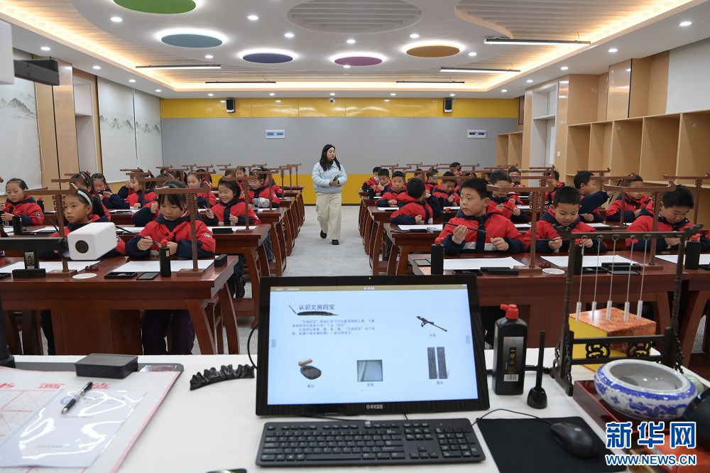 图为2025年12月22日,恩施州鹤峰县第二实验小学学生通过华文众合智慧书法教学系统上书法课。新华网发 杨顺丕摄