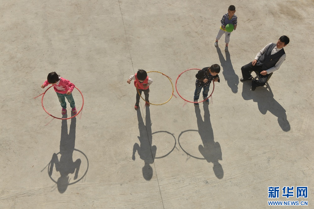 图为2016年5月25日,恩施州建始县景阳镇偏坦教学点老师周用肖为仅有的4名学生上体育课。新华网发 杨顺丕摄