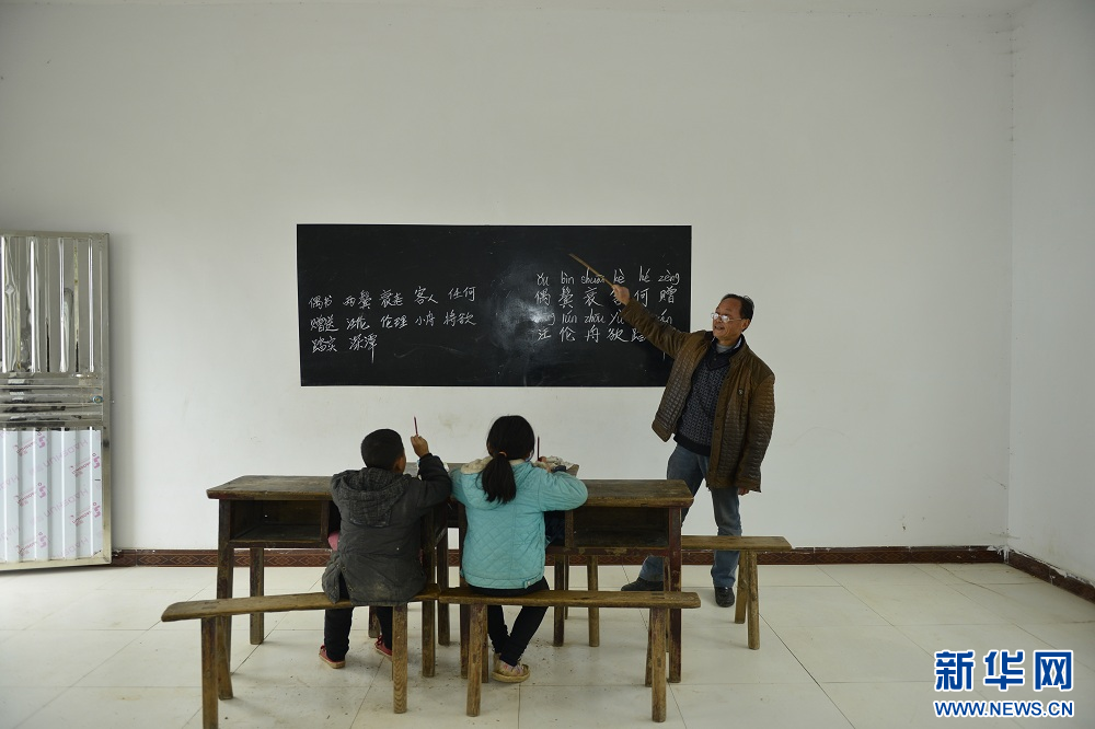图为2014年11月27日,恩施州巴东县溪丘湾乡堰塘坪教学点的老师袁本安在给学生朱蓉(中)、谭建辉(左)上课。新华网发 杨顺丕摄