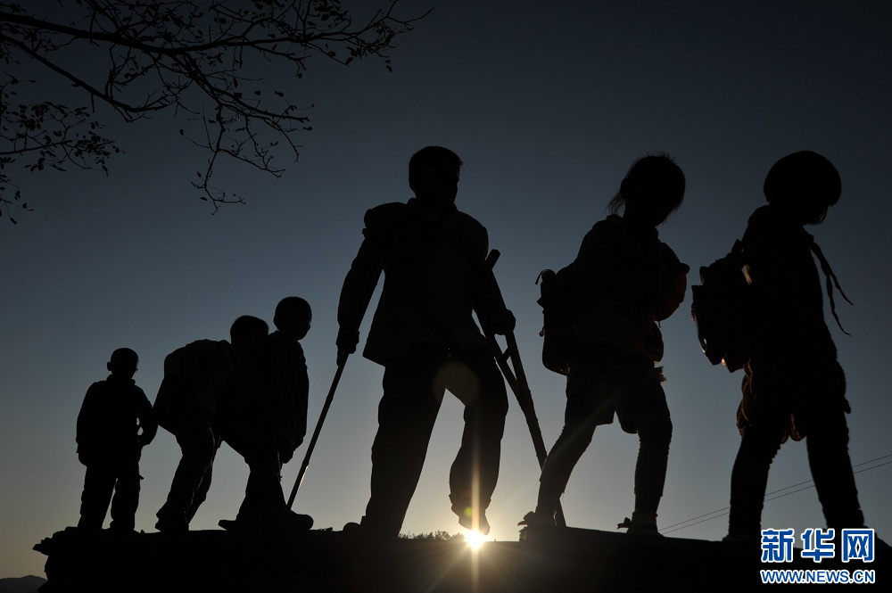 图为2011年10月8日,恩施州巴东县清太坪镇姜家湾教学点的“拐杖老师”谭定才护送学生回家。新华网发 杨顺丕摄