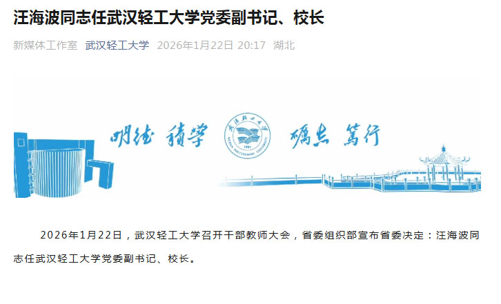 2026年1月22日,武汉轻工大学召开干部教师大会,省委组织部宣布省委决定:汪海波同志任武汉轻工大学党委副书记、校长。