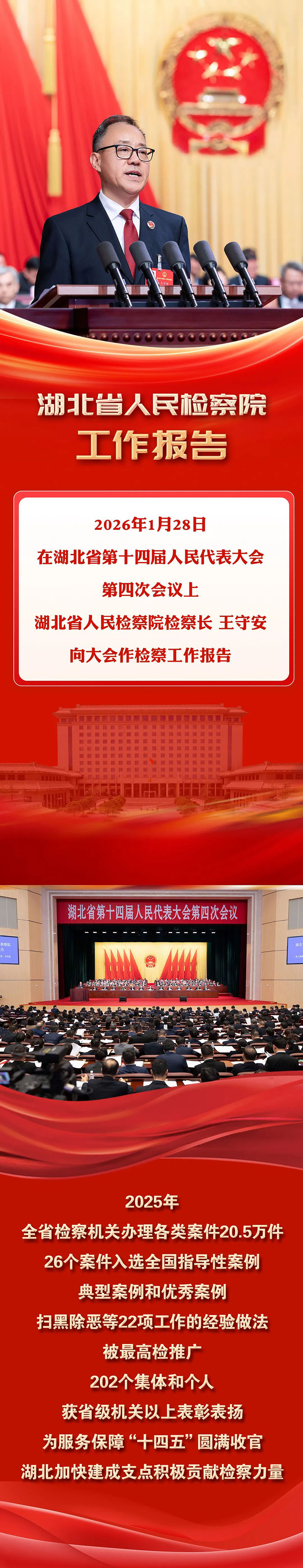1月28日,湖北省人民检察院检察长王守安代表省人民检察院向省第十四届人民代表大会第四次会议作检察工作报告。王守安从维护平安稳定、服务支点建设、践行司法为民、强化检察监督、自觉接受监督、锻造高素质队伍等六个方面,对过去一年湖北检察工作进行全面回顾和总结。(连迅、李晓笛、吴学敏)