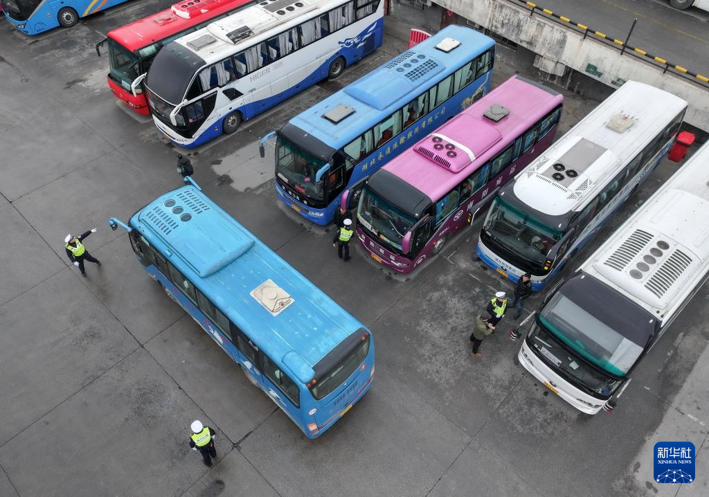 1月29日,在湖北省武汉市宏基长途客运汽车站,武汉交警对长途汽车进行安全检查(无人机照片)。新华社发(赵军摄)