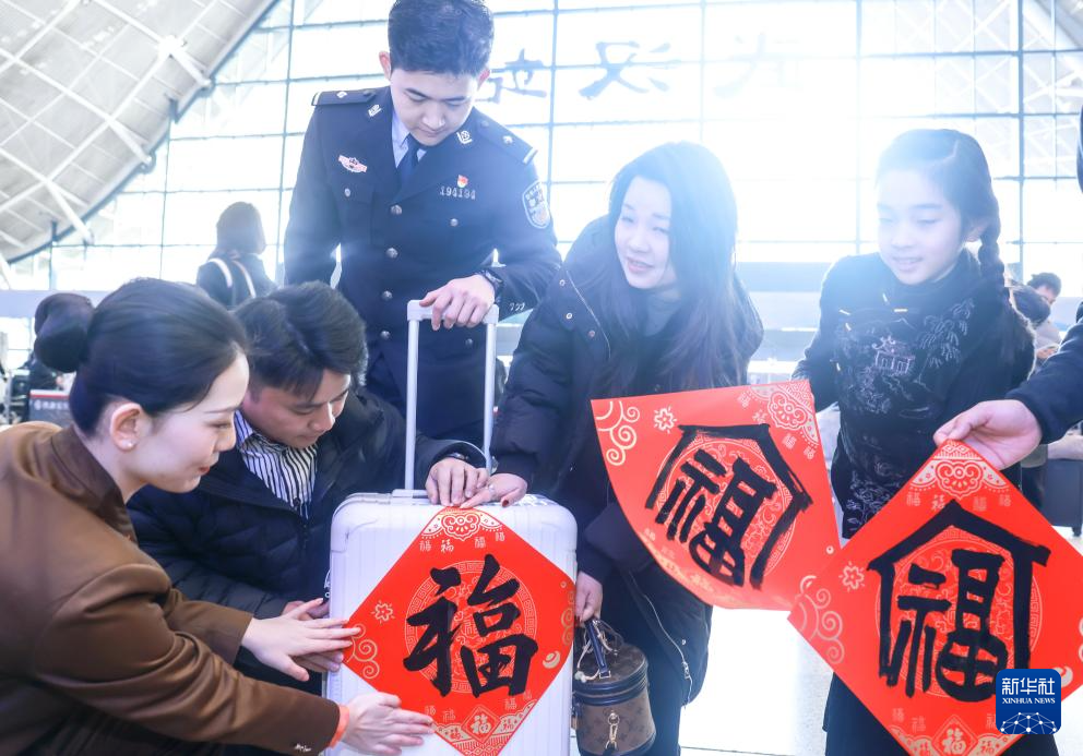 2月2日,在湖北省武汉站,铁路工作人员给旅客送“福”字。新华社发(赵军摄)