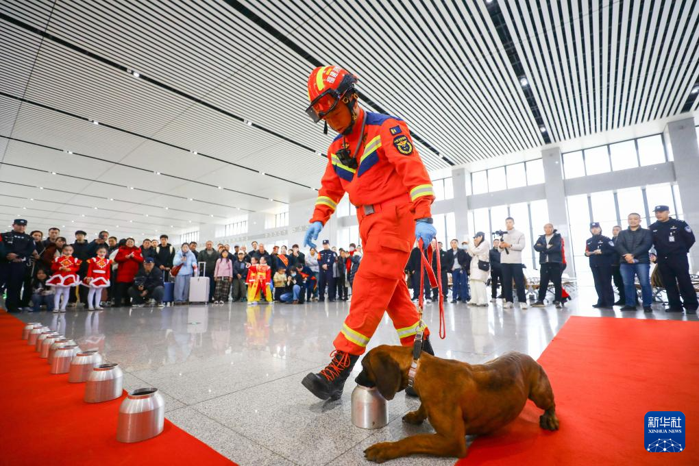 2月2日,在福建三明北站候车厅,消防队员进行搜排爆犬科目表演。新华社发(张海根 摄)