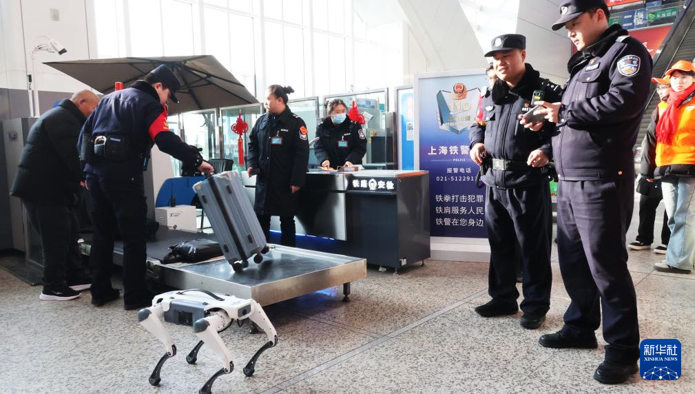 2月2日,在江苏省连云港站,一只机器狗参与安检。新华社发(耿玉和摄)