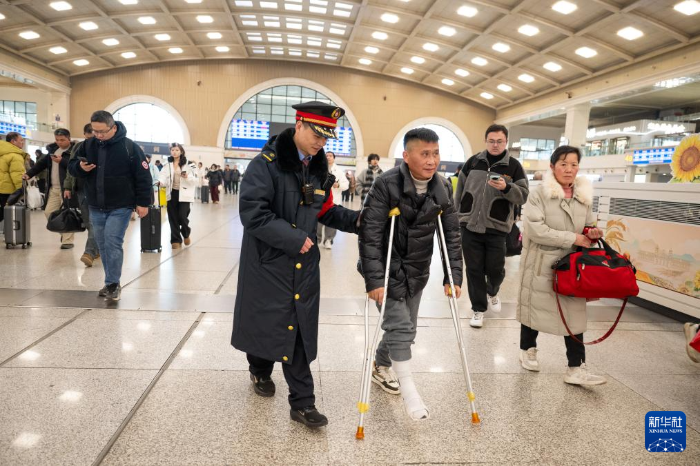 2月2日,湖北省武汉市汉口火车站工作人员帮助旅客进站乘车。新华社记者 肖艺九 摄